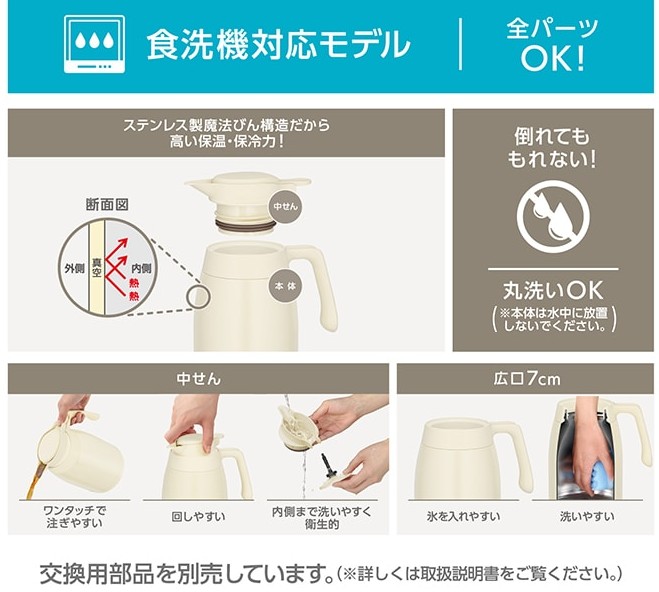 簡単に分解できて流路まで洗える中せんと、手洗いもしやすい広口設計♪