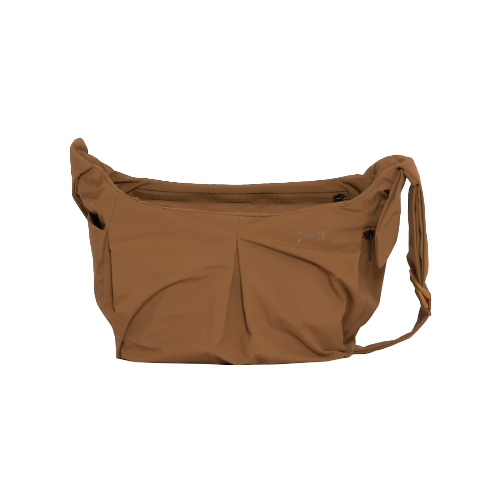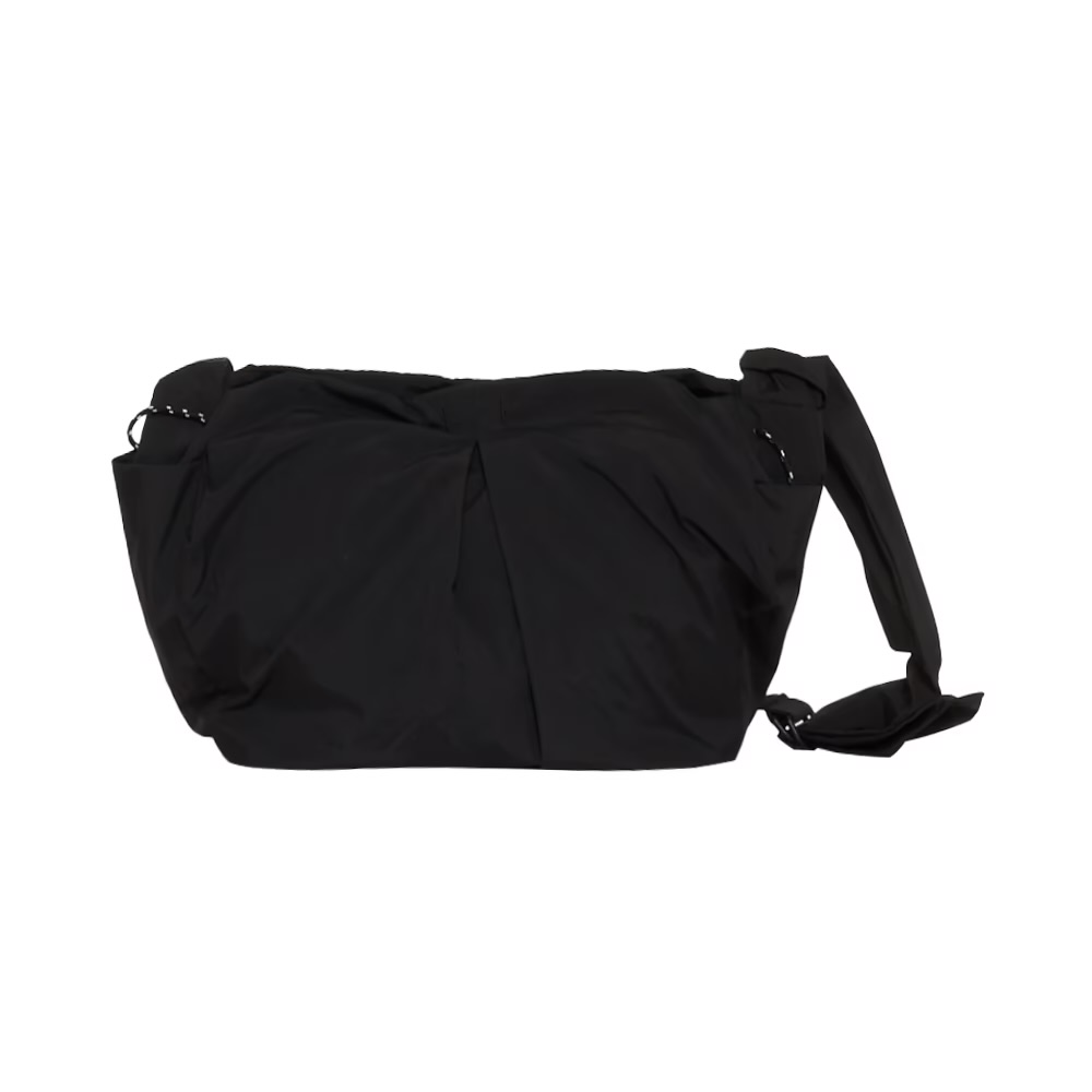 アウターガーメントのポケットに見られるオーバーサイズの作りでザックリと仕上げています。素材は衣料用で使われるような光沢感を抑えたヴィンテージライクなリサイクルナイロンを使用(フッ素フリーのC0撥水を採用)。タスラン糸を使用した平織り素材でコットンライクな日本産のテキスタイルです。ショルダーベルトは二重にしたDカン仕様。調整部分は素材の質感を活かしてシワを表現させた、”しぼりデザイン”にしています。大小の2型展開で、前後の見付け側には隠しファスナーポケットをレイアウト。底芯は立ち上げ可能な仕様で、移動時の少量の荷物に対応でき、収納時にもスペースを軽減できるようにしました。ショルダーM:普段使いに最適なミドルサイズショルダー。軽快さを重視したデザインで本体収納部分はファスナー開閉式仕様。前側は小分けのポケット付きに。内装は11インチのタブレット端末が収納できます。外側の脇マチポケットは、ペットボトルなどが入るポケットと、スマートフォンなどが収納可能なファスナーポケットをレイアウト。ショルダーL:カジュアルスタイルのビッグサイズショルダー。口元は巾着仕様で、コードはオリジナルで作成しました。荷物が少ない時は、巾着部分を下に降ろすとすっきり見えます。また、スナップホックが付いていますので、コードを締めずに使うこともできます。前側は左右に小物ポケットを配置。内装は13インチPCが収納できるポケットが付いています。脇マチポケットはペットボトルや折傘が収納でき、コードもしまうこともできます。