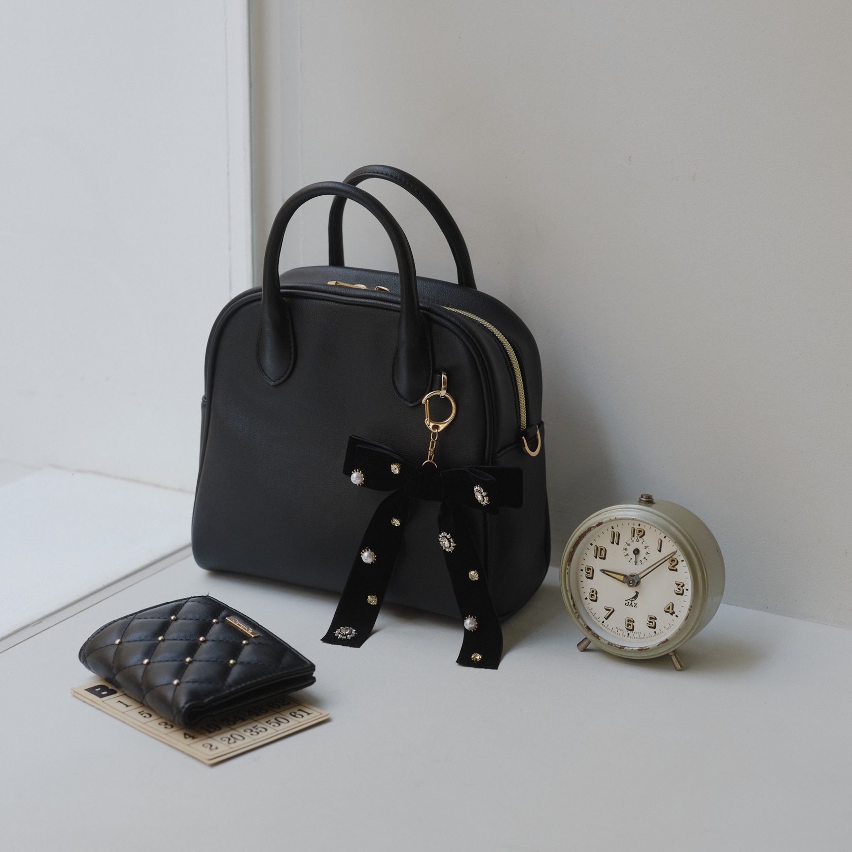 フェイクパールやビジューをあしらったエレガントなリボンチャームをつけて。