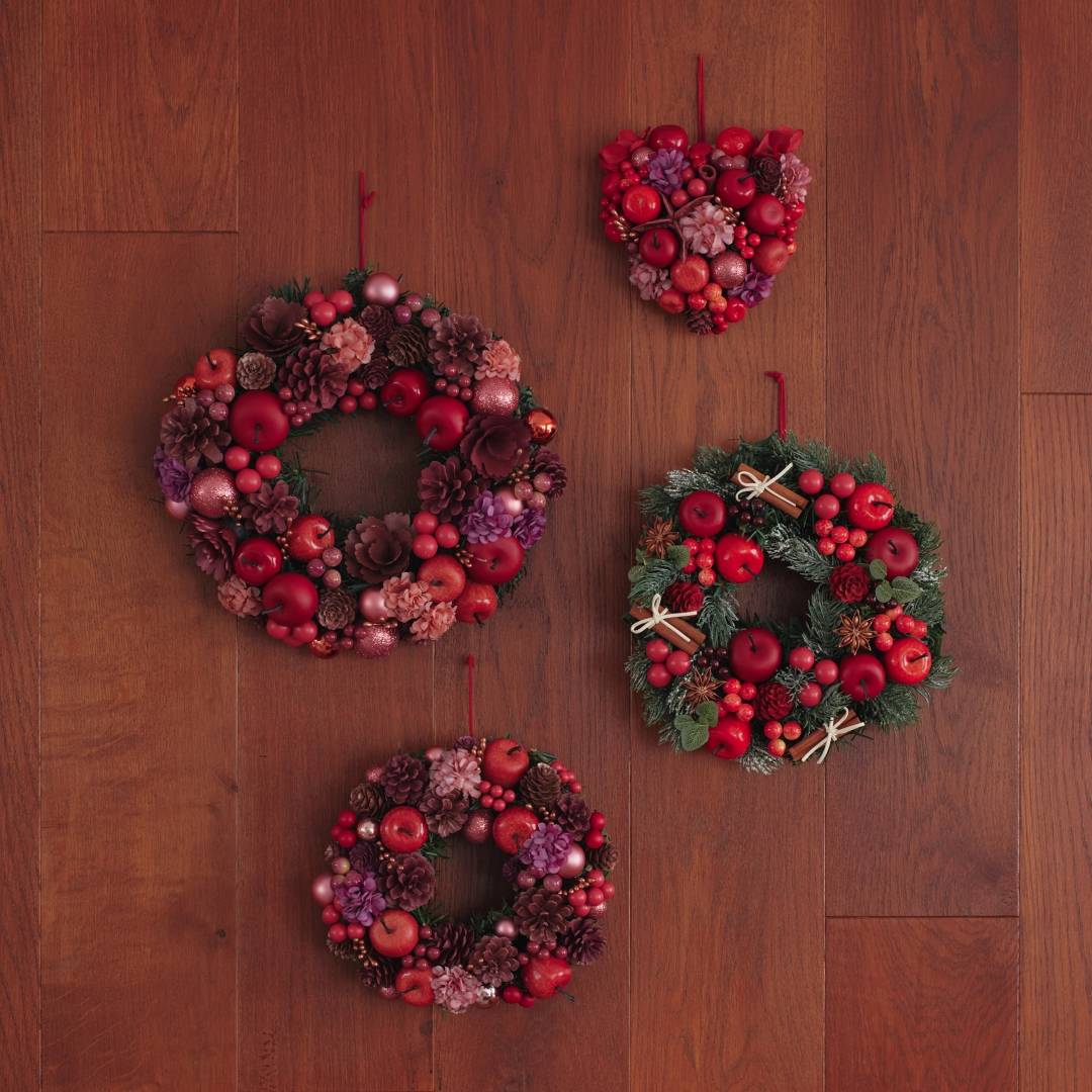 インテリアに合わせて選べるリースやリンゴの形のスノードームなどデコレーションアイテムも種類豊富に揃います。