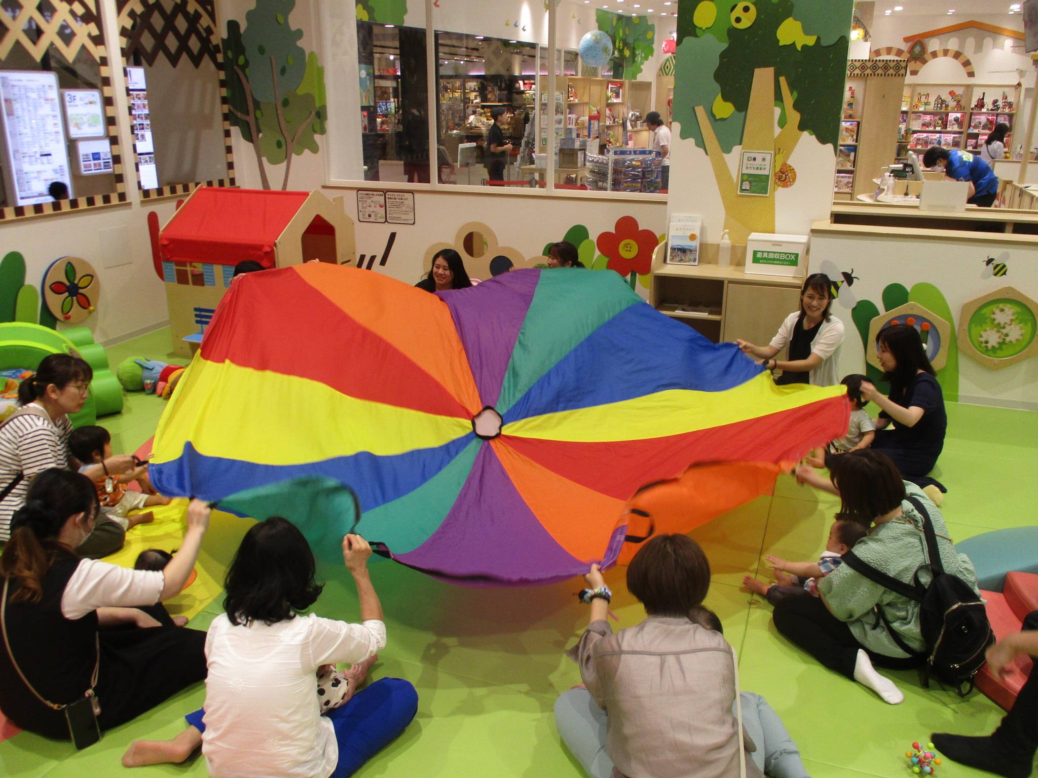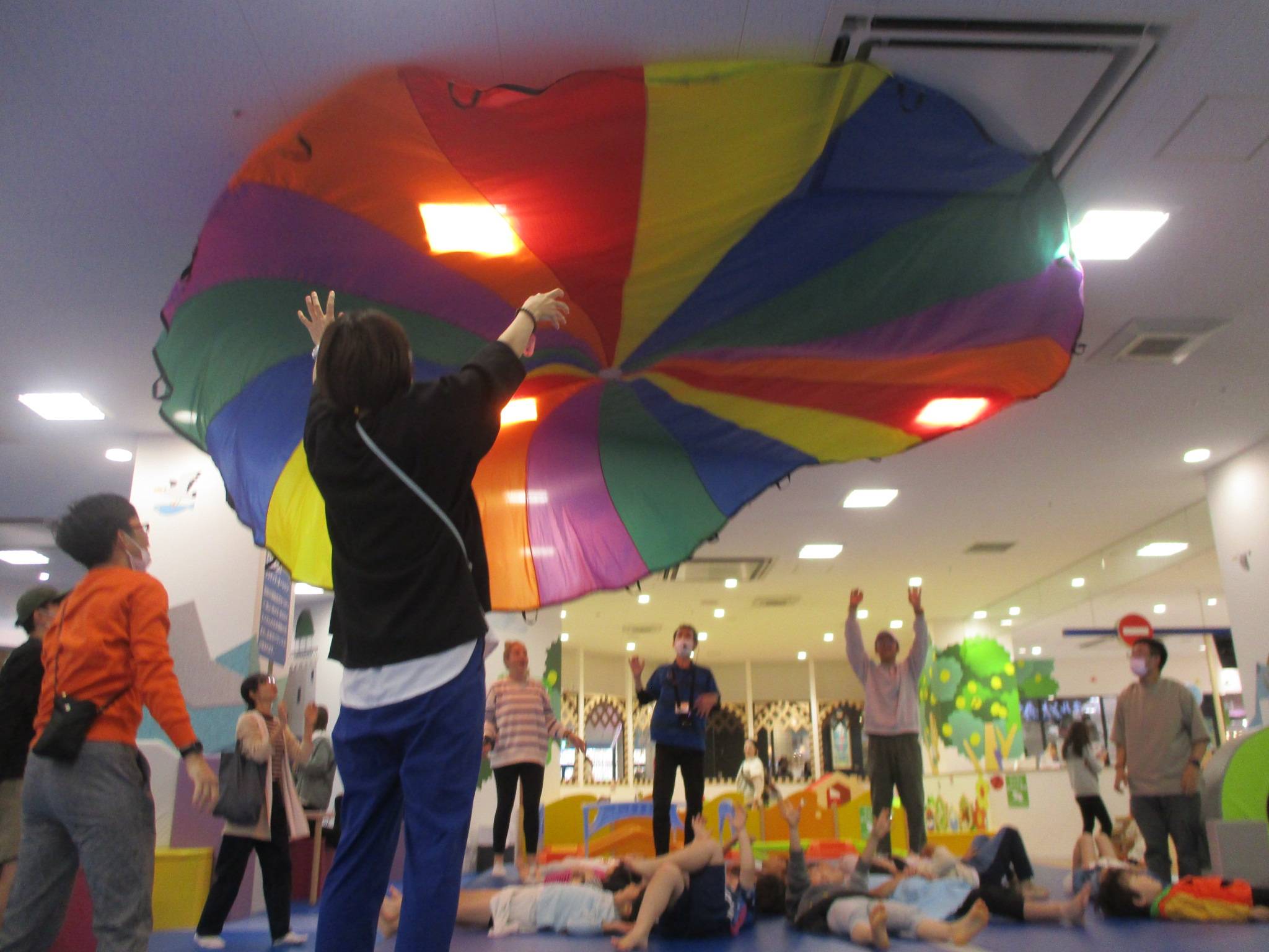 キドキドでは、カラフルな大きい布で遊ぶからだあそびのイベントを土曜日と日曜日に開催しています。