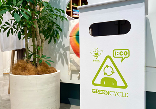 MARK IS みなとみらいの各店舗では、古着やプラスチックの空き容器の回収をしています。お客さまからいただいた大切な資源として、次の姿へと循環させていきます。